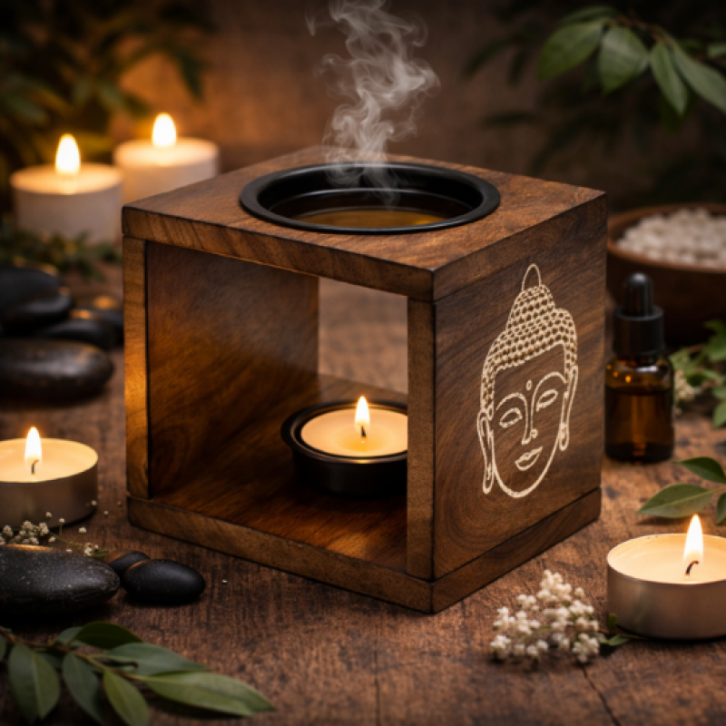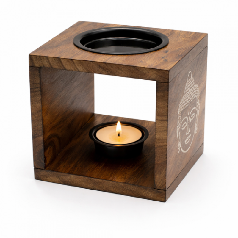 Arzator Mare Patrat pentru Uleiuri din Lemn de Mango – Chipul lui Buddha