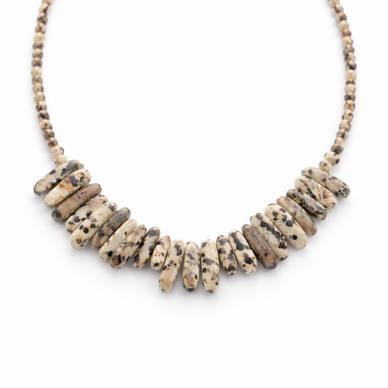 Colierul Piatra Dalmatian este o bijuterie cu personalitate, inspirata din energia jucausa si naturala a acestei pietre unice. Designul imbina pietre dalmatiene alungite, cu textura si petele lor specifice, completate armonios de un sir de pietre rotunde mai mici, pentru un efect vizual echilibrat si expresiv.