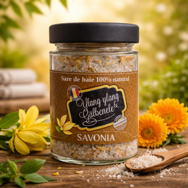 Ingrediente: Sare din salina, ulei esențial de ylang ylang, flori de gălbenele