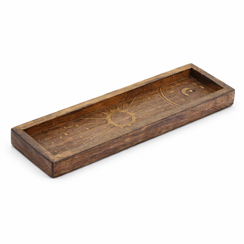Realizat din lemn de mango cu o nuanta rustica placuta, suportul este decorat cu un motiv solar inconjurat de simboluri zodiacale, oferind un simbolism subtil si echilibrat. Designul se potriveste atat in decoruri mistice sau boeme, cat si in spatii minimaliste sau naturale.