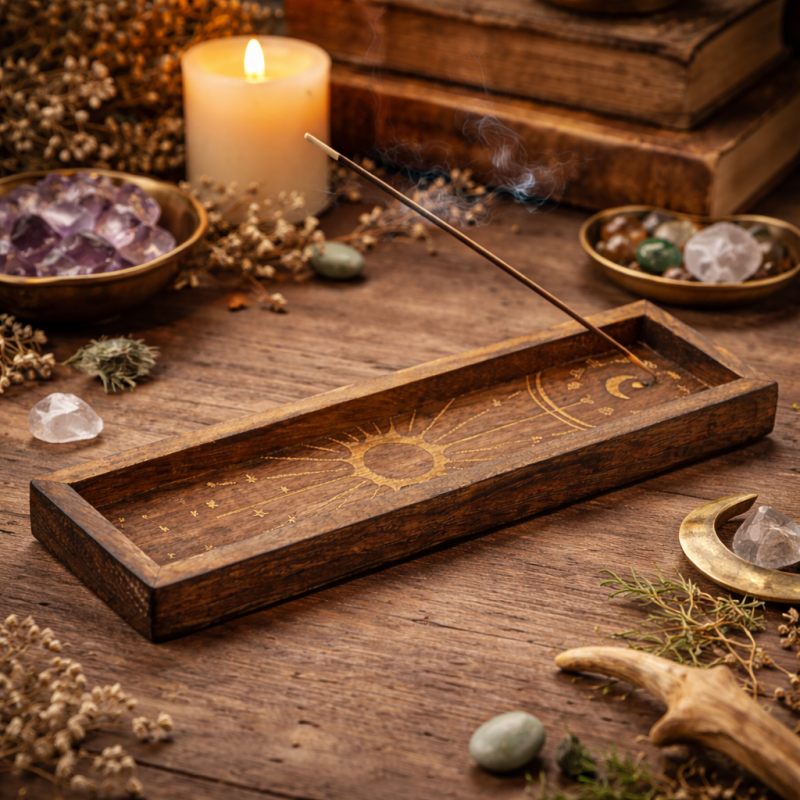 Dispune de un locas special pentru betisoare parfumate si margini usor ridicate pentru a retine cenusa. Forma alungita este ideala pentru expunerea cristalelor slefuite, a pietrelor semipretioase sau pentru a fi asezat pe un altar, o comoda sau o masuta decorativa.