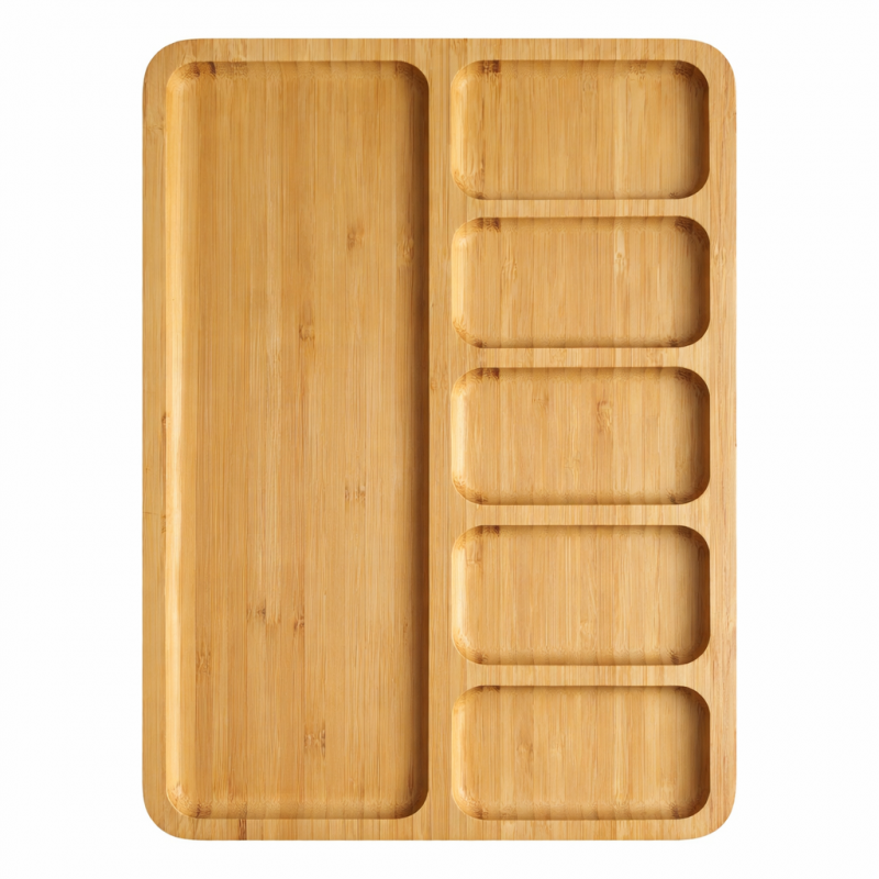 Aceasta tava din bambus 100% natural este conceputa pentru o servire practica si eleganta a gustarilor, aperitivelor sau condimentelor. Designul sau inteligent combina mai multe compartimente mici pe o jumatate a tavii, ideale pentru sosuri, nuci, fructe uscate sau masline, cu un compartiment mare, continuu, perfect pentru legume, branzeturi, biscuiti sau alte gustari mai voluminoase.