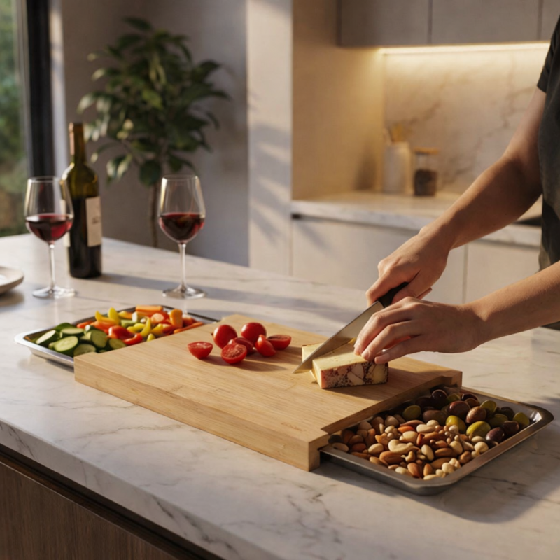 Tocator din Bambus cu 2 Containere Glisante din Inox